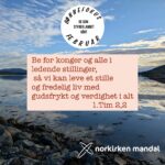 1.Tim 2,2 Be for konger og alle i ledende stillinger, så vi kan leve et stille og fredelig liv med gudsfrykt og verdighet i alt.